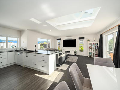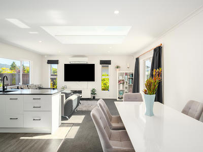 - Beautiful open plan kitchen/dinng/living with feature skylight, heat pump and sliding door out to patio