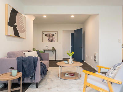 A fresh decor including new carpet, with two double bedrooms and a bathroom on the lower level and a loft bedroom with a second bathroom upstairs. Open plan kitchen with good bench space and a spacious living room with views to the garden.